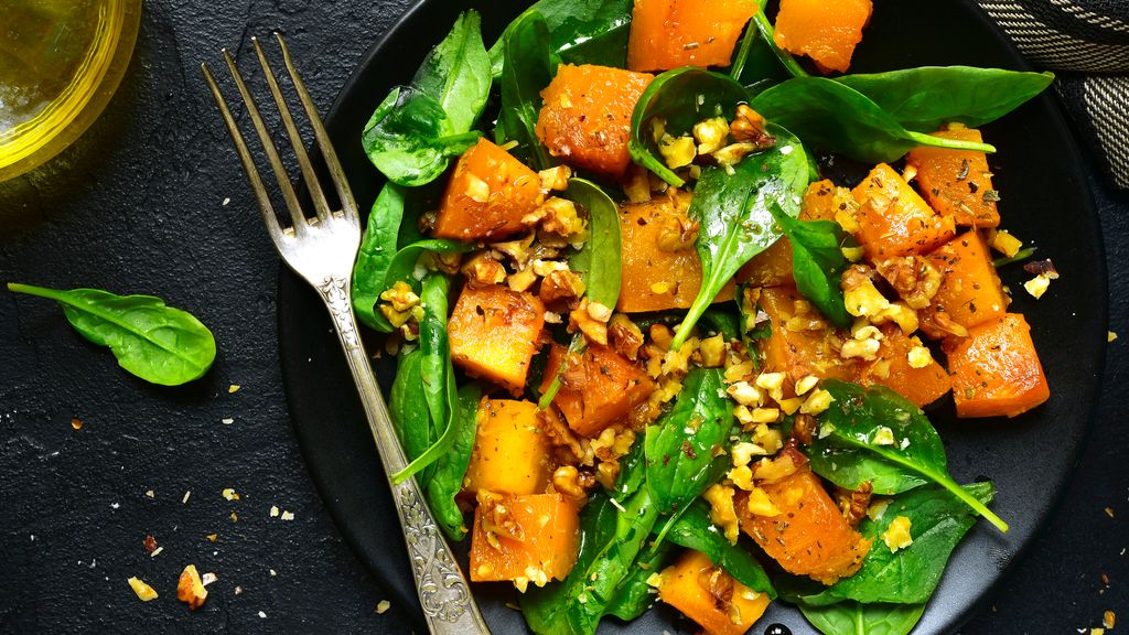 Salade de potiron rôti, aux épinards et aux noix : une recette gourmande et raffinee qui seduit par ses saveur…