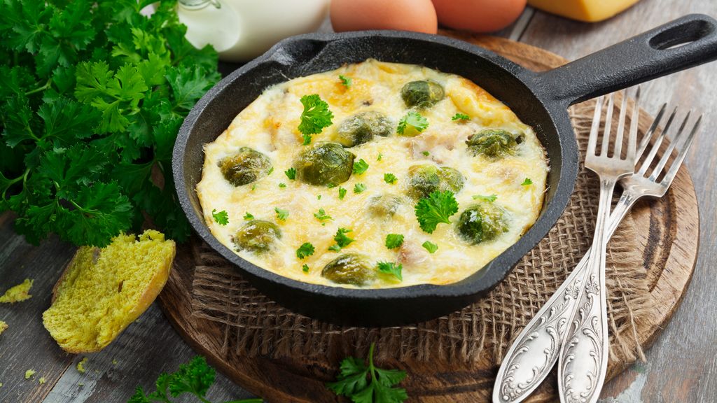 Omelette au fromage et aux choux de bruxelles : cette preparation culinaire met en valeur des ingredients de qualite.