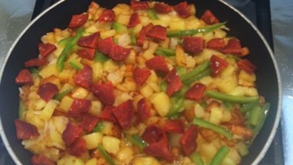 oeuf, pomme de terre, oignon, poivron vert, chorizo, ail, poivre, sel, huile de tournesol