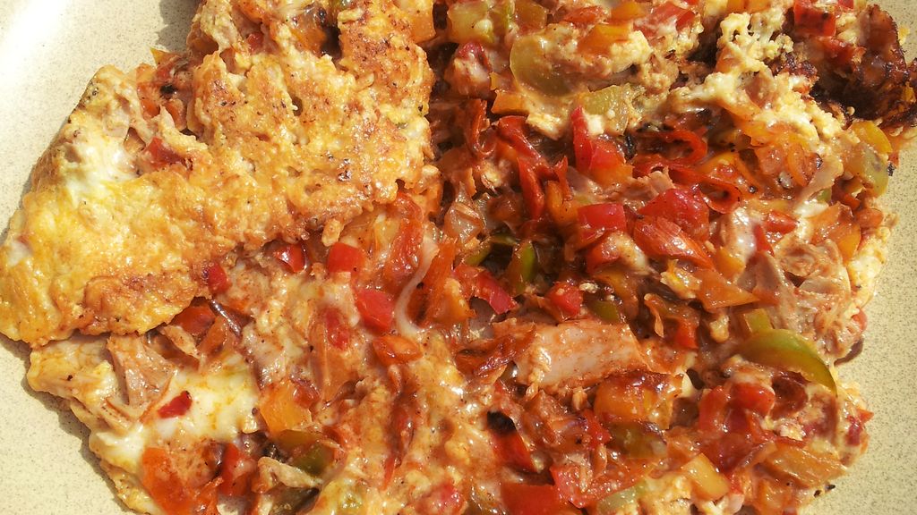 oeuf, oignon, poivron rouge, curcuma, sel, poivre, huile d'olive