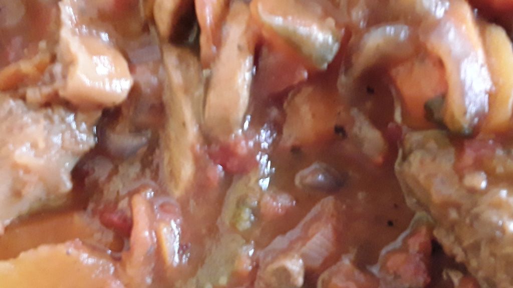 jarret de veau, oignon, ail, carotte, poireau, tomate, orange, céleri, concentré de tomates, anchois, muscadet, persil, coriandre, sucre, farine, huile…