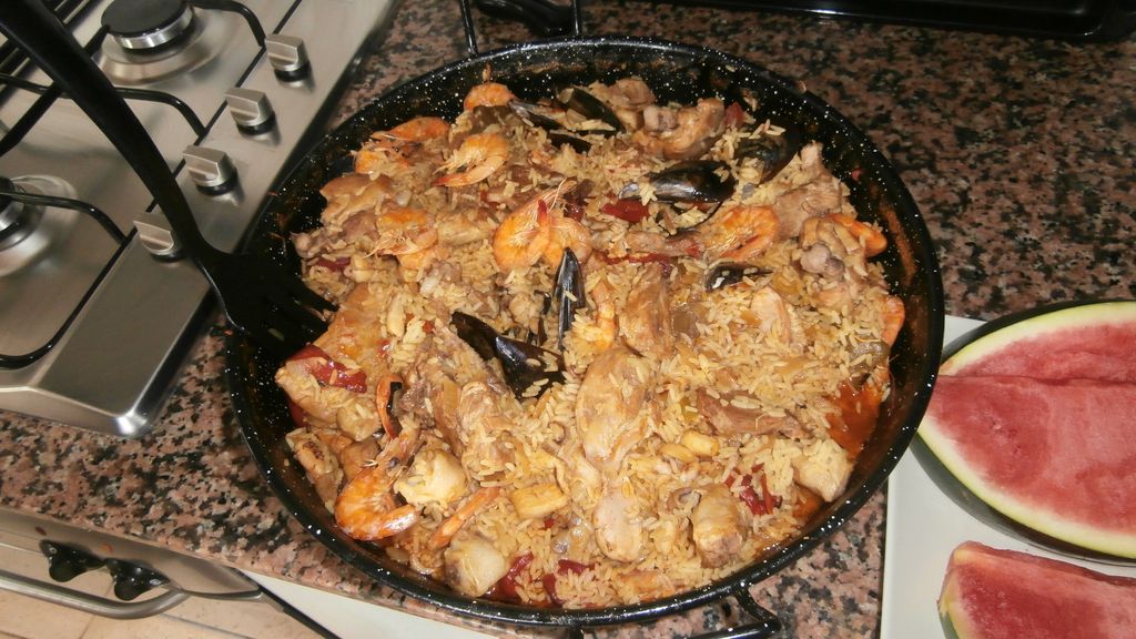 poivron vert, poivron rouge, échine de porc, cuisse de poulet, crevettes, calamar, poulpe, moules, riz long, spigol, oignon, ail, tomates…