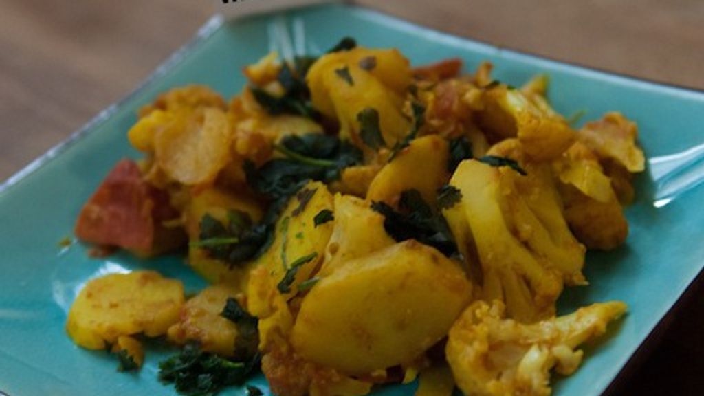 pomme de terre, chou-fleur, tomate, échalote, ail, curry, curcuma, cumin, huile d'olive, coriandre, sel