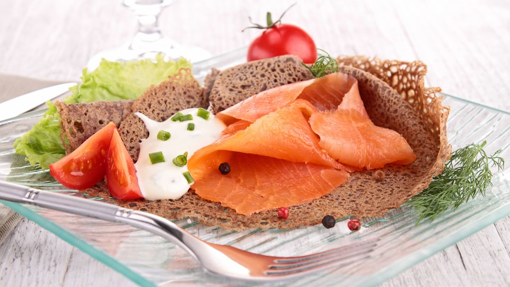 saumon fumé, tomate, salade, crème fraîche, poivre, sel, galette de sarrasin