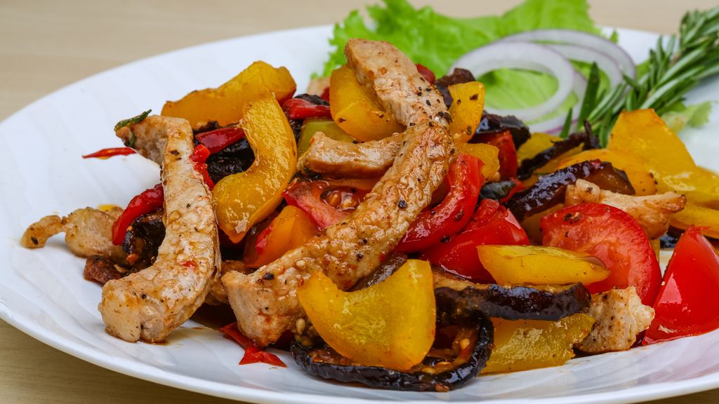 échine de porc, pomme de terre, patate douce, tomate, poivron jaune, oignon, ail, curry, petit piment, poivre, sel, huile
