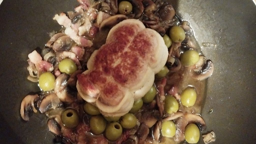 paupiette de veau, champignons de Paris, lardons, beurre, oignon blanc, olives vertes, vin blanc, poivre, sel