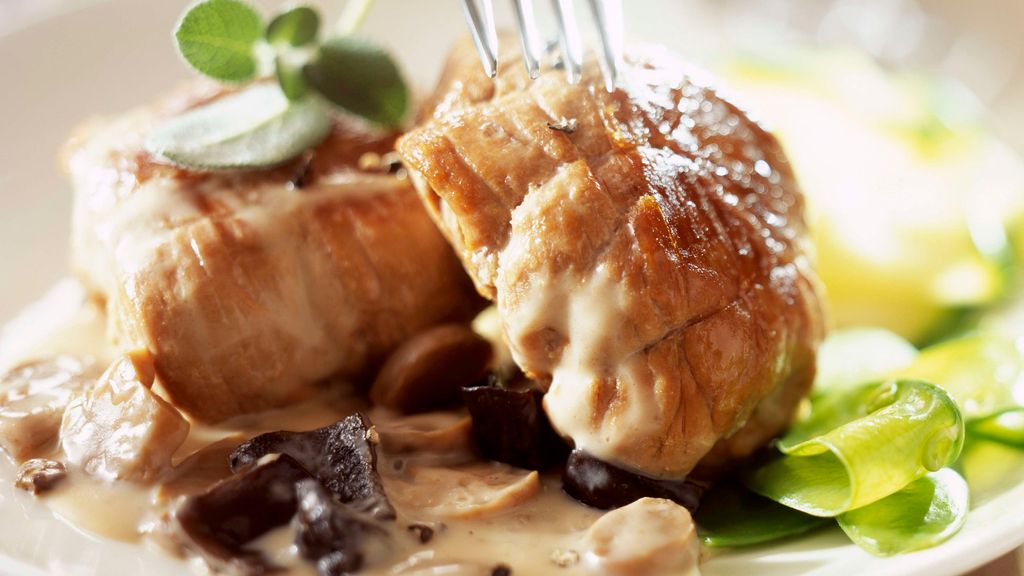 paupiette de veau, champignons de Paris, bouillon, échalote, farine, crème fraîche, poivre, sel