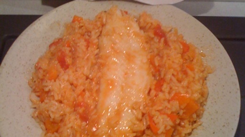 panga, riz, poivron, oignon, tomate, cube de bouillon