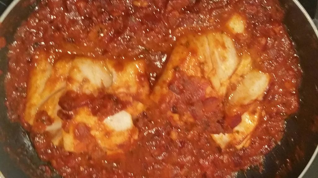 lieu noir, poivron vert, oignon, tomates pelées, poivre, sel, curry, huile d'olive