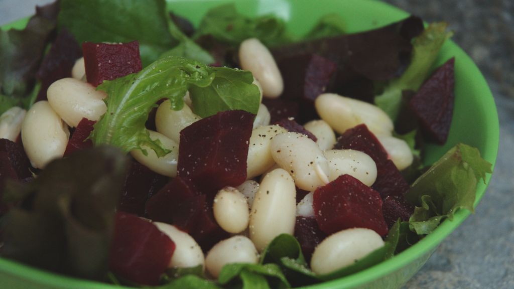 coco de paimpol, oignon, bouquet garni, mâche, betterave, ail, vinaigre, huile de noix, poivre, sel