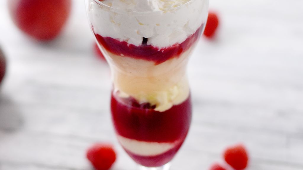 pêche, crème, crème liquide, framboises, sucre en poudre, sucre glace, citron, vanille