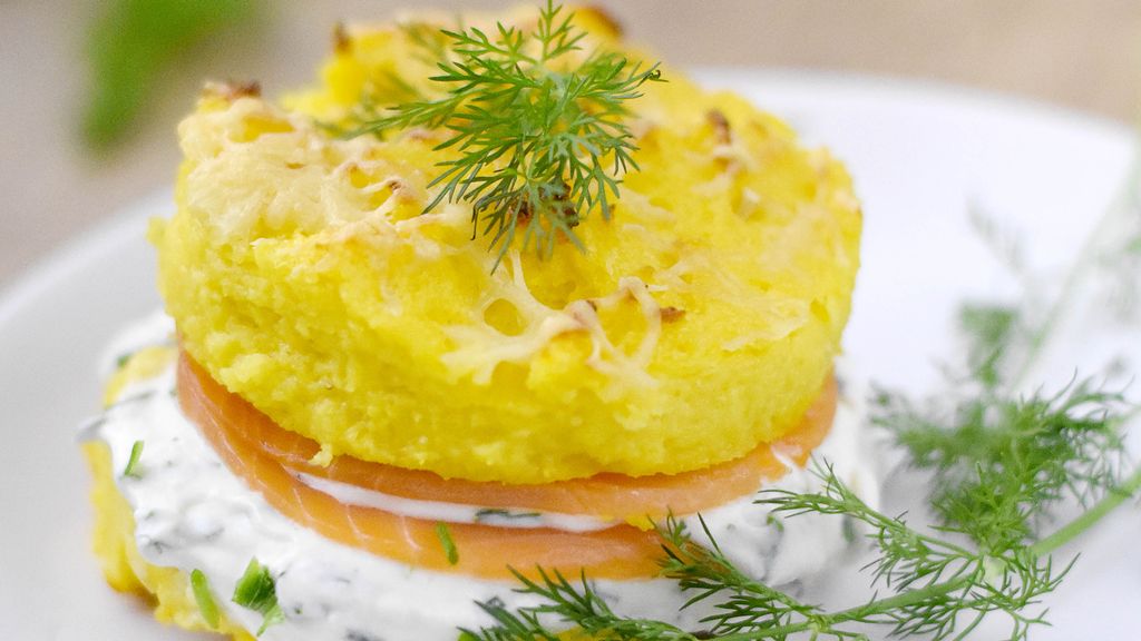 eau, lait, cube de bouillon, polenta, safran, muscade, beurre, fromage râpé, mozzarella, saumon fumé, crème fraîche, ciboulette, poivre, sel