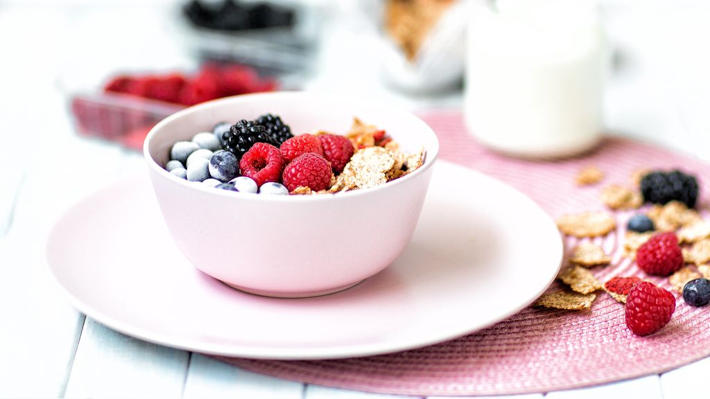 banane, flocons d'avoine, lait, framboises, eau, sirop d'agave, granola, myrtilles
