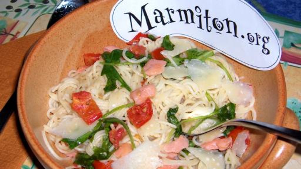 spaghetti, lardons, roquette, tomates confites à l’huile, poivre, huile d'olive, huile, parmesan