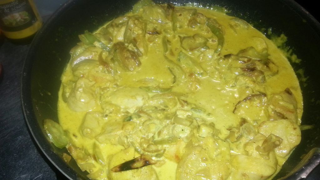 filet de poulet, oignon, champignon, curry, lait de coco