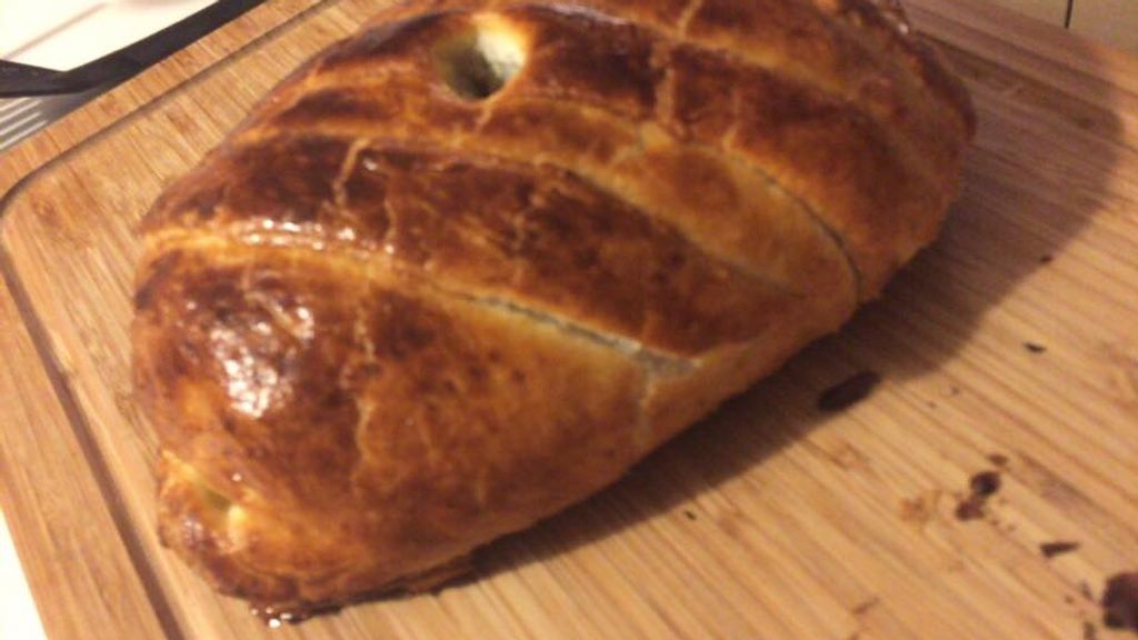 Rosbif, pâte feuilletée, oignon, jambon cru, moutarde, jaune d'oeuf, sucre