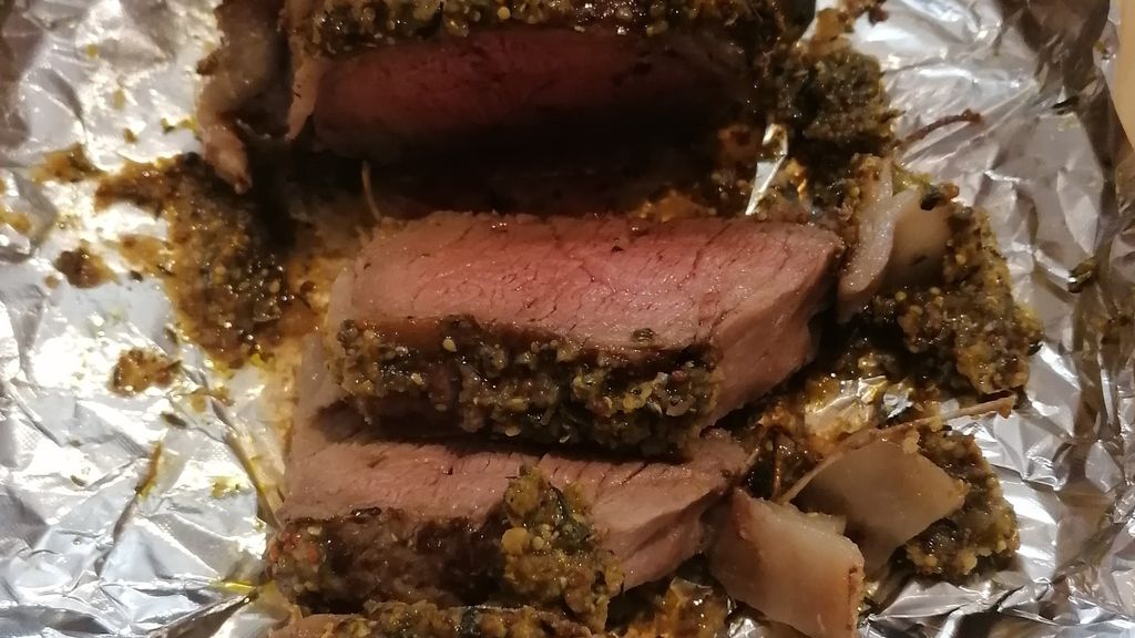 Rosbif, moutarde à l'ancienne, pesto, pignons, chapelure, herbes, ail, huile d'olive