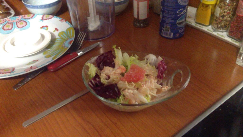pamplemousse, crabe, salade, crème fraîche, ketchup, cognac, poivre, sel
