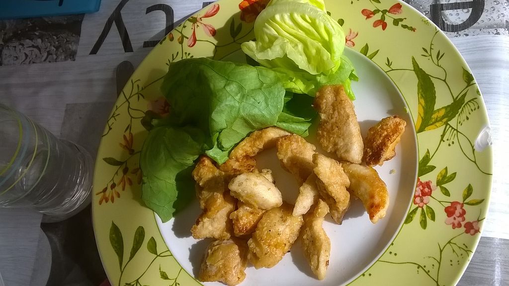cuisse de poulet, sauce soja, saké, gingembre, ail, farine, huile, citron, laitue