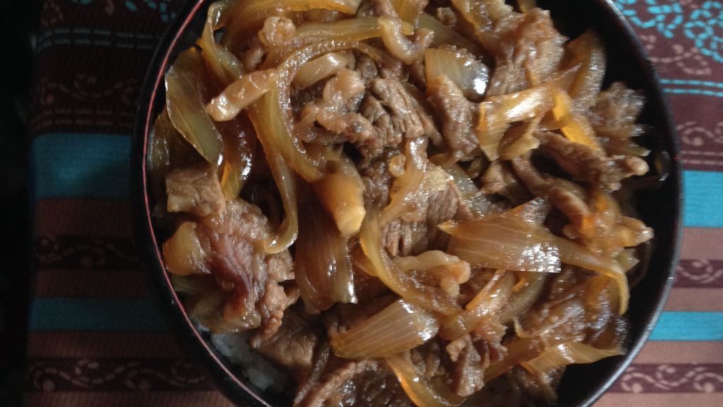 oignon, boeuf, saké, mirin, sucre en poudre, sauce soja, dashi, riz rond, oeuf