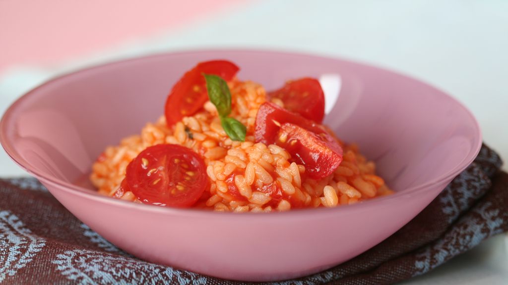 riz pour risotto, huile d'olive, poivre, sel, oignon, ail, tomates concassées, bouillon, basilic frais