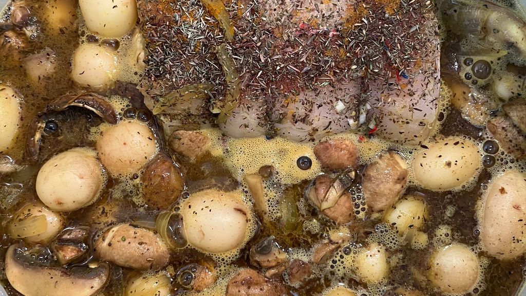rôti de porc, oignon, ail, moutarde, miel, bouillon, poivre