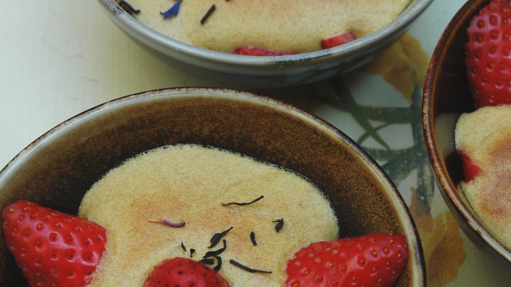 fraises, jaune d'oeuf, sucre, crème, thé