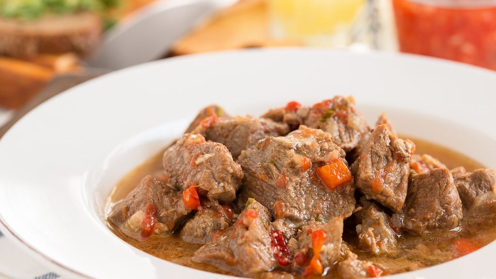 sauté de porc, oignon, farine, concentré de tomates, vin blanc, carotte, pomme de terre, poivre, sel, bouquet garni, paprika