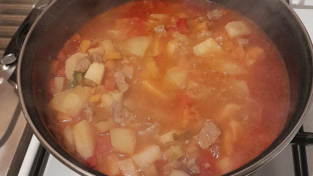 veau, carotte, céleri branche, oignon, poivron rouge, poivron vert, poivron jaune, coulis de tomate, eau, cumin, paprika, poivre, sel, coriandre