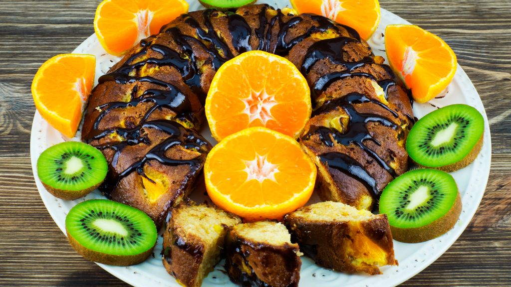 orange, kiwi, citron, ananas, levure de boulanger, farine, sucre en poudre, sucre vanillé, oeuf, beurre, sirop de sucre de canne,…