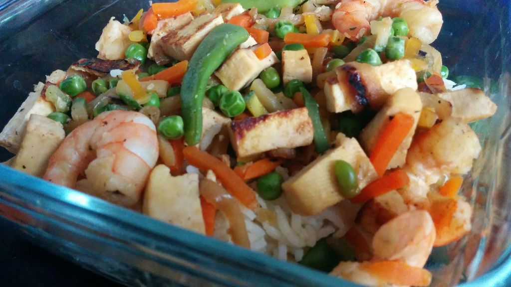 tofu, julienne de légumes, riz basmati, échalote, sauce soja, sel, poivre, huile d'olive