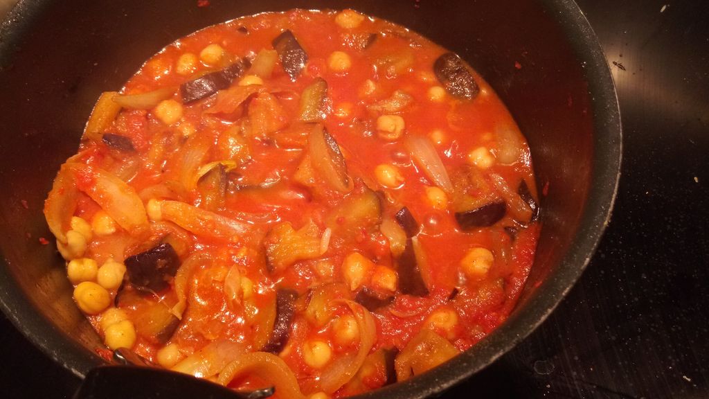 aubergine, oignon jaune, pois chiches, coulis de tomate, tofu, gingembre, paprika, cumin, huile d'olive, lait de coco, coriandre