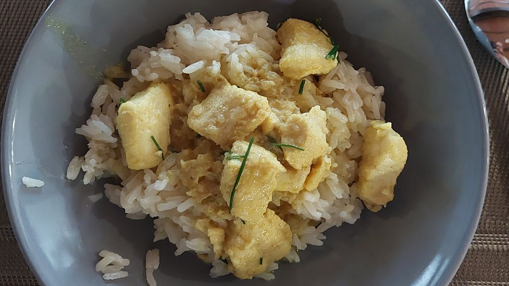 pangasius, lait de coco, oignon, huile, pâte de curry, cassonade, citron vert, ciboulette