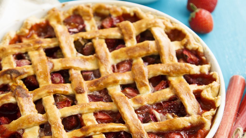 pâte brisée, biscuits à la cuillère, rhubarbe, sucre, fraises, oeuf, crème liquide, sucre en poudre, sucre glace, sucre vanillé