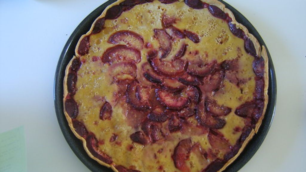 pâte feuilletée, sucre, farine, beurre, crème fraîche, oeuf, maïzena, semoule, amandes en poudre, pêche, prune