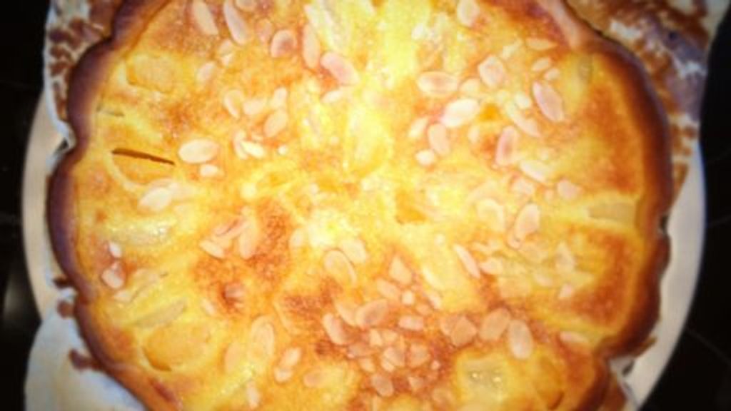 poire, pêche, pâte sablée, oeuf, amandes en poudre, crème liquide, sucre vanillé, sucre en poudre