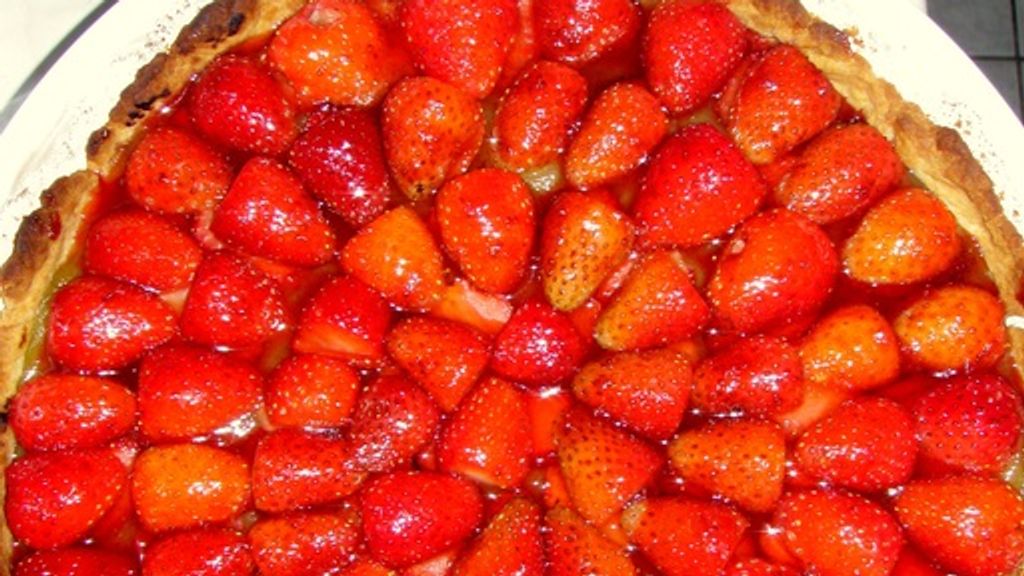 pâte brisée, biscuits à la cuillère, rhubarbe, sucre, fraises, oeuf, crème liquide, sucre en poudre, sucre glace, sucre vanillé