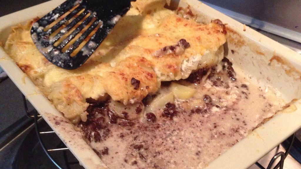 boudin noir, pomme, camembert, crème liquide, pomme de terre