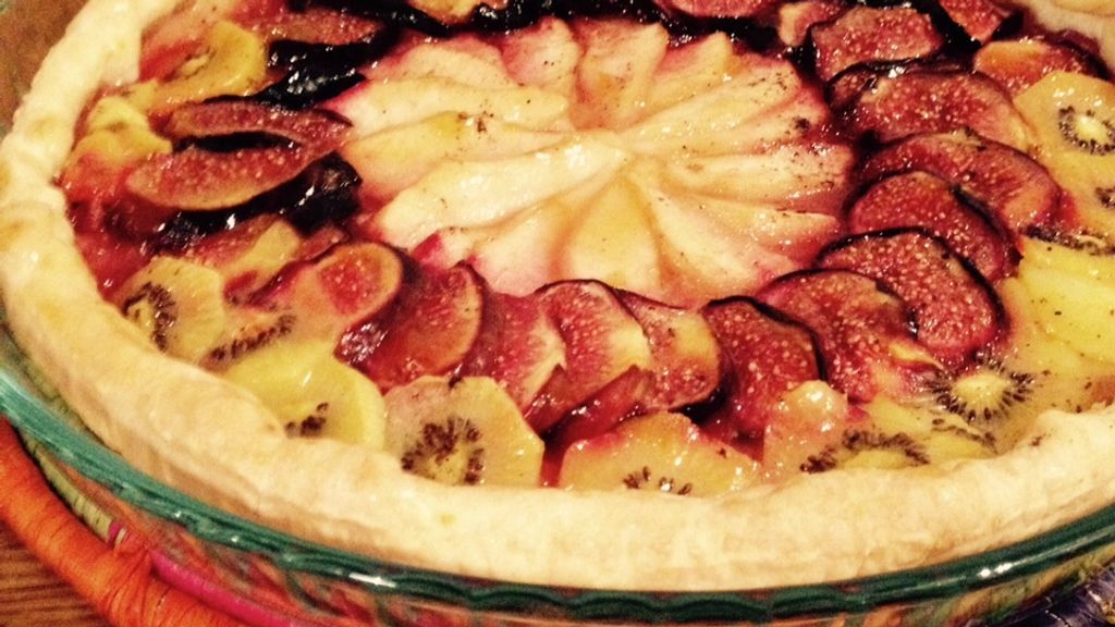 pâte feuilletée, figue, poire, kiwi, pomme, beurre, cassonade, vanille, confiture d'abricot