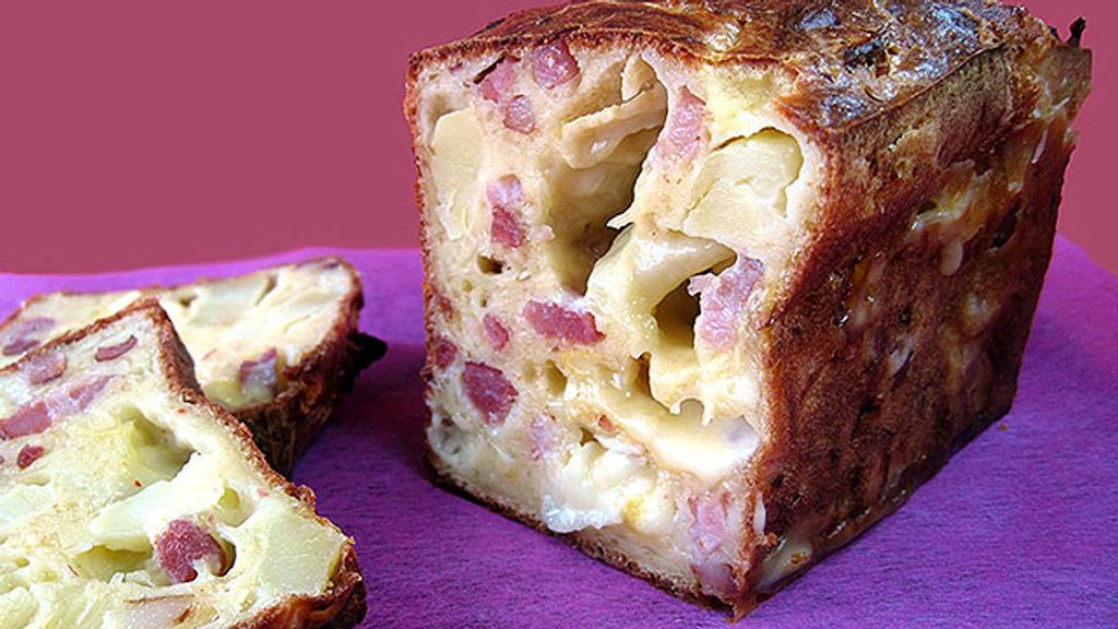 oeuf, farine, levure chimique, huile, lait, gruyère râpé, poivre, sel, oignon jaune, lardons fumés, reblochon