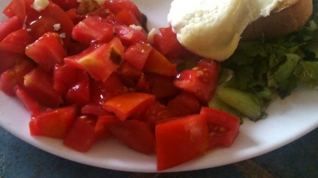 pain de campagne, tomate, crottin de Chavignol, herbes de Provence, basilic, poivre, sel, tabasco, huile d'olive, ail