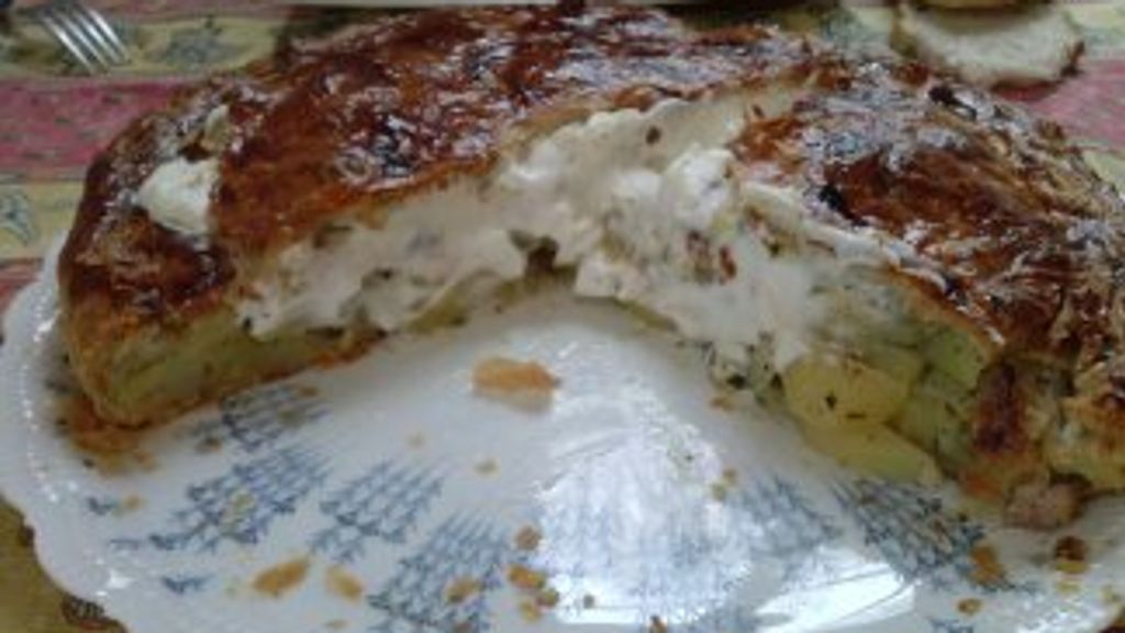 pomme de terre, pâte feuilletée, crème fraîche épaisse, oignon, persil, jaune d'oeuf, poivre, sel