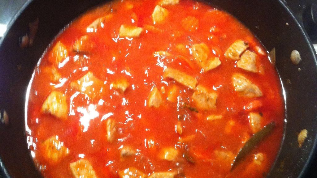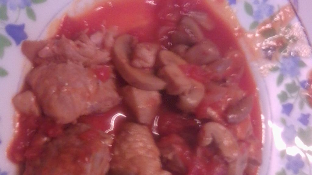 sauté de porc, tomates pelées, champignons de Paris, oignon, vin blanc, curry, poivre, sel, huile d'olive