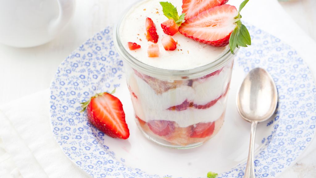 fromage blanc, oeuf, fraises, sucre, biscuits à la cuillère, jus d'orange, menthe