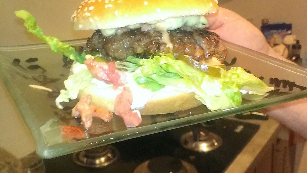 concombre, poivron rouge, tomate, steak haché, pain pour hamburger, bleu d'Auvergne, sauce hamburger, huile de tournesol
