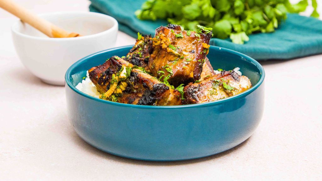 travers de porc, gingembre, ail, gingembre, miel, huile de sésame, sauce soja, eau, sel, coriandre