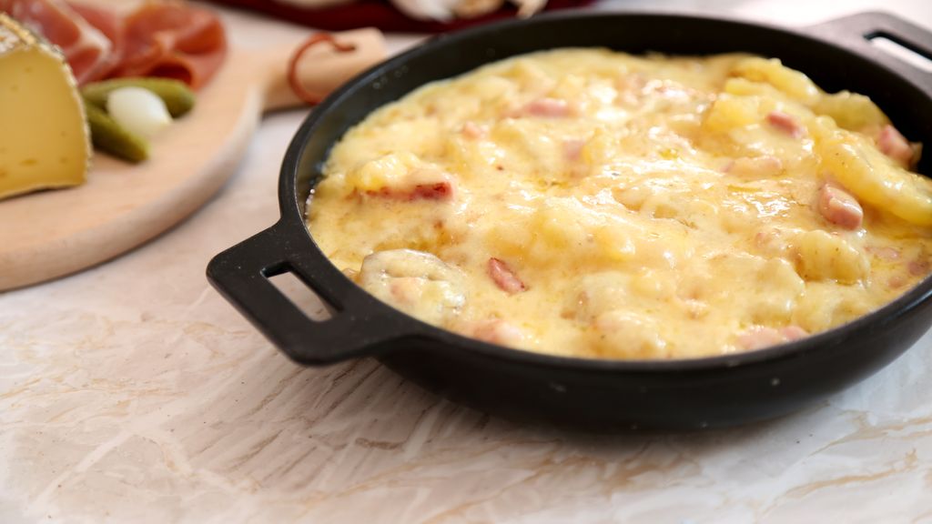 saint-nectaire, cantal, emmental, roquefort, pomme de terre, oignon, lardons, ail, crème fraîche, vin blanc sec