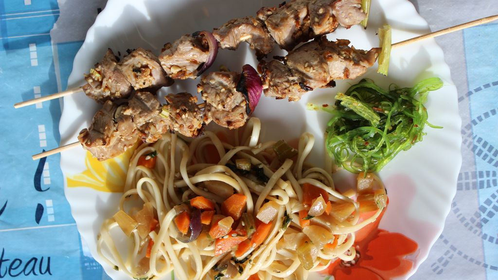 nouilles, steak, chou chinois, échalote, oignon nouveau, ail, gingembre, coriandre, harissa, sauce soja, sauce Yakitori, bouillon de volaille