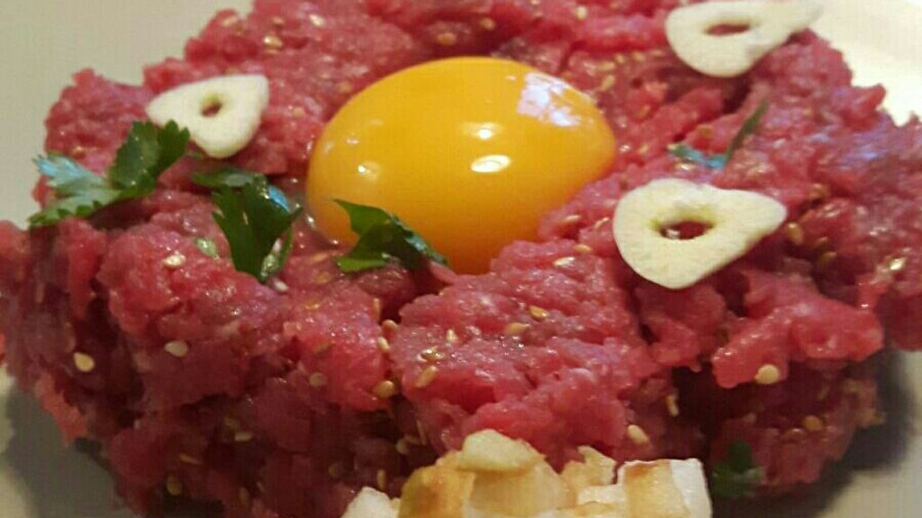 viande hachée, sésame, huile de sésame, pomme, poire, ail, jus de citron, oeuf